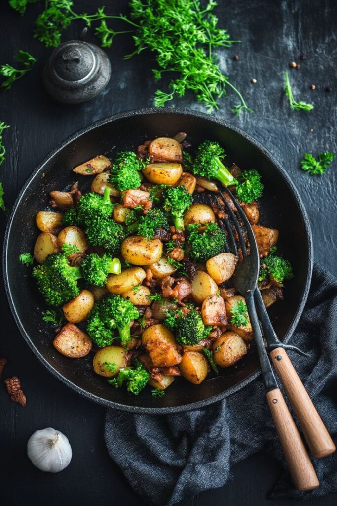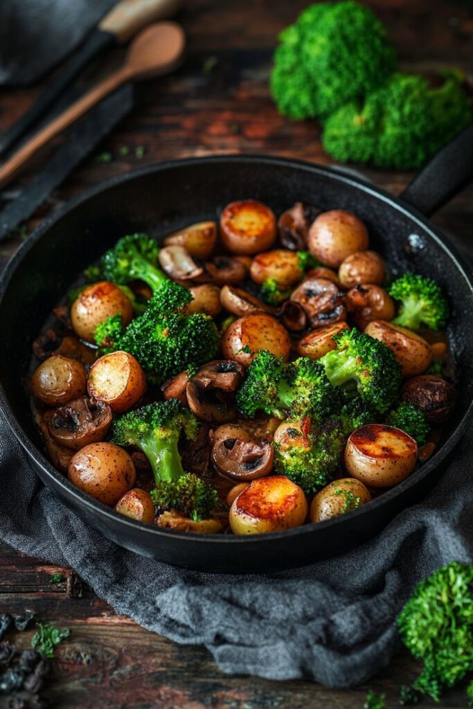 Die natürlichen Farben der Zutaten – goldene Kartoffeln, grüner Brokkoli und braune Pilze – schaffen eine warme, einladende Farbpalette. Garnieren Sie mit frischen Kräutern für zusätzliche Farbakzente.
