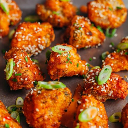 Dieses Gericht kombiniert perfekt knusprig gebackenen oder frittierten Blumenkohl mit einer cremigen, süß-würzigen Bang Bang Sauce aus Mayonnaise, süßer Chilisauce und einem Hauch Sriracha.