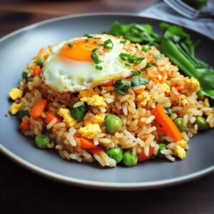 Gebratener Reis mit Gemüse und Ei ist ein beliebtes, vielseitiges Gericht, das in vielen Kulturen geschätzt wird – besonders in der asiatischen Küche.