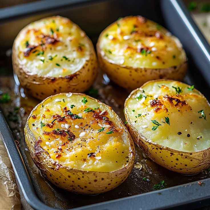 Zum Aufwärmen die Kartoffeln bei 180°C für 15-20 Minuten in den Ofen geben, bis sie durchgewärmt sind. Mikrowelle ist möglich, aber die Textur wird nicht so gut.