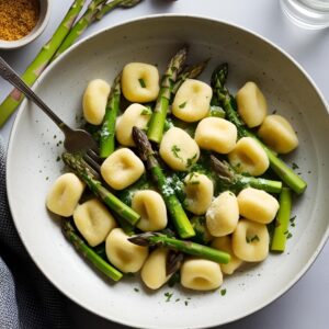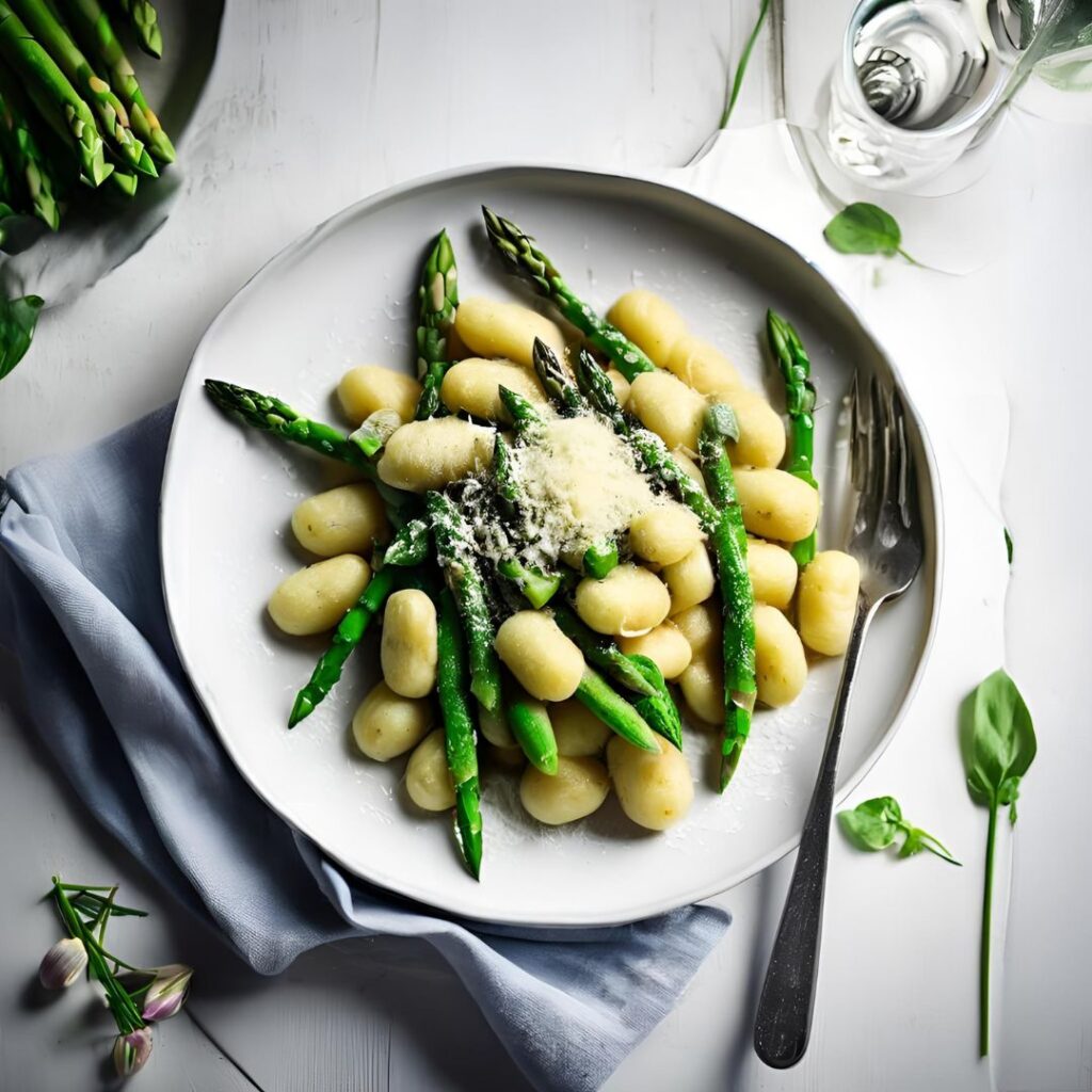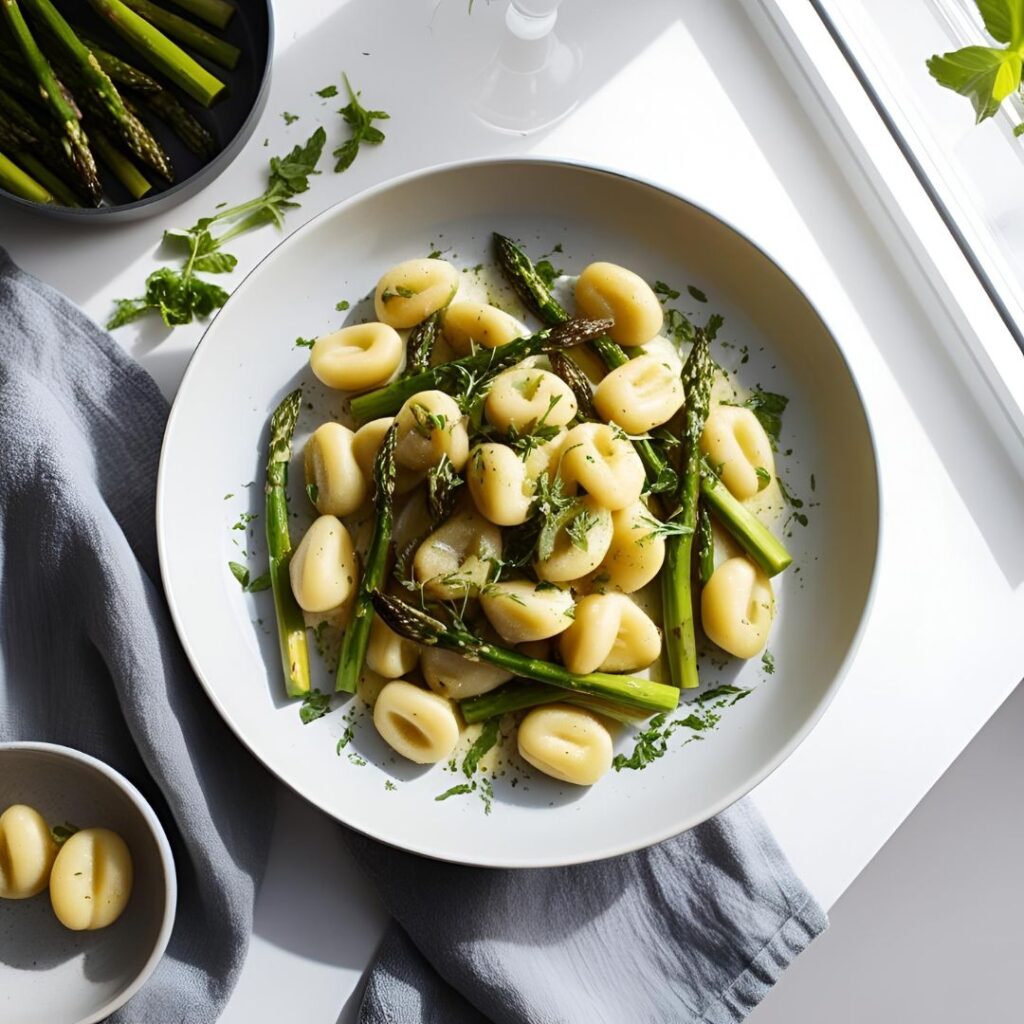 Zarte, hausgemachte oder gekaufte Gnocchi werden mit frischem, knackigem grünem Spargel kombiniert, der in Butter oder Olivenöl gebraten wird, um seine natürliche Süße und Frische zu betonen.
