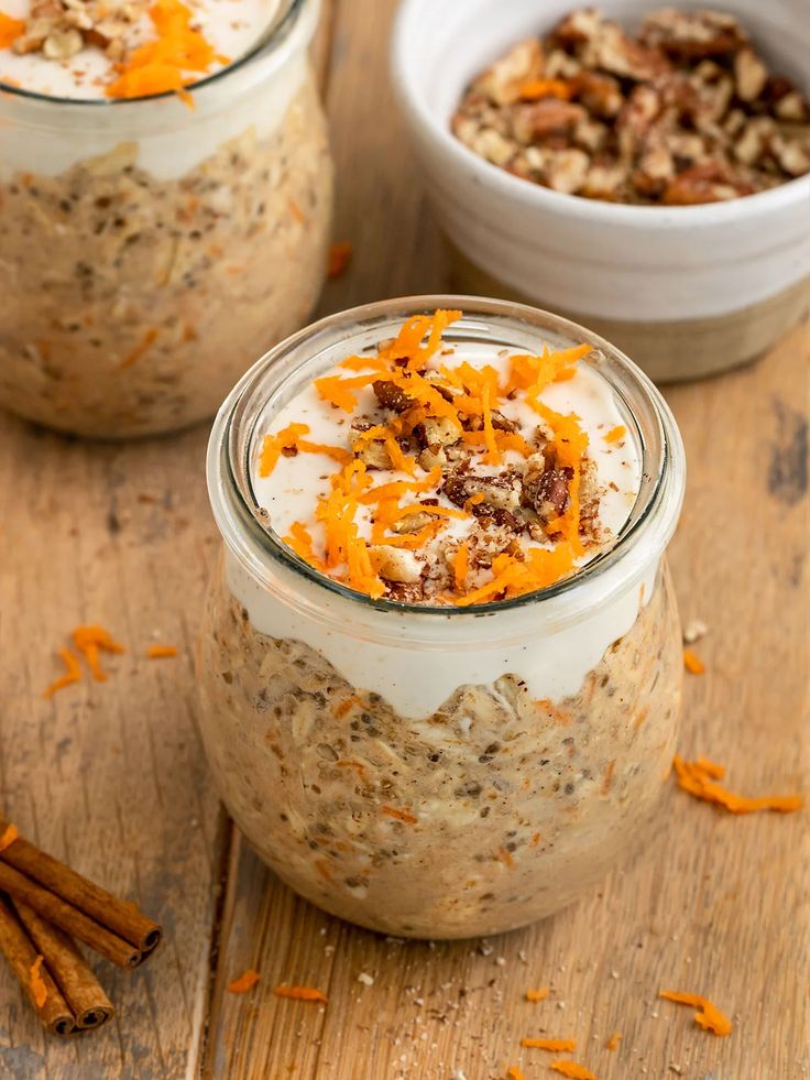 Zimt, Muskatnuss und eine Prise Ingwer verleihen den Overnight Oats den typischen Karottenkuchen-Geschmack. Eine kleine Menge Vanilleextrakt verstärkt das Aroma. - Eiweißreiche Varianten