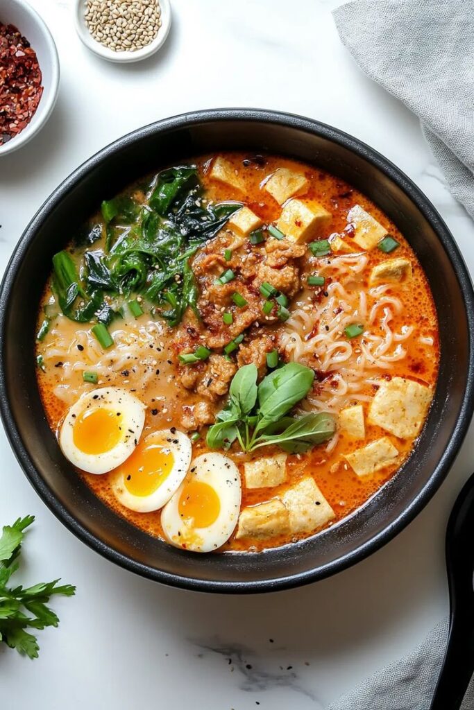 Diese innovative Fusion-Kreation vereint die Bequemlichkeit der Ein-Topf-Küche mit den komplexen Geschmacksprofilen der asiatischen Küche. Das Ergebnis ist eine sättigende, nahrhafte Mahlzeit, die sowohl Ramen-Liebhaber als auch Fans cremiger Suppen begeistert.