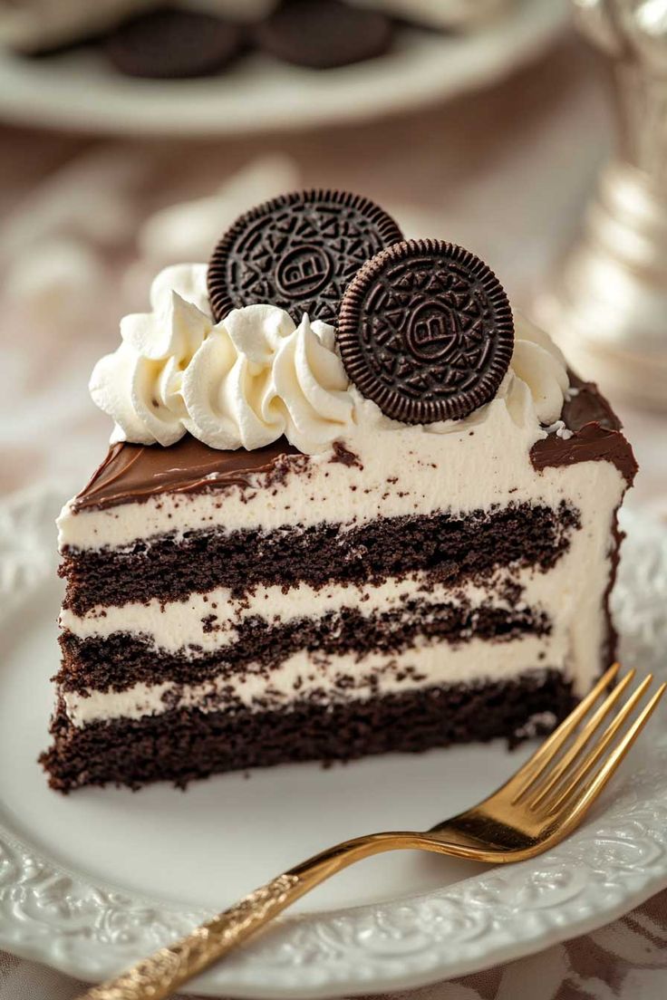 • Kuchen dekorieren: Mit Sahnetupfen und halbierten Oreo-Keksen verzieren.