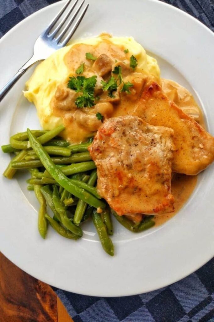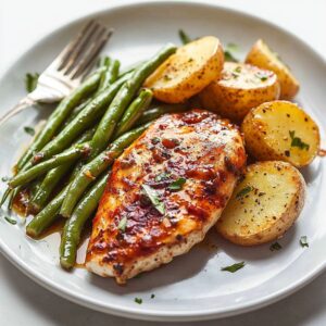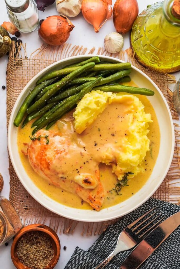 Diese harmonische Kombination aus saftigem, knusprig gebratenem Hähnchen, cremigem Kartoffelpüree und frischen grünen Bohnen repräsentiert das Beste aus verschiedenen kulinarischen Traditionen und schafft ein Gericht, das sowohl Komfort als auch Eleganz ausstrahlt.