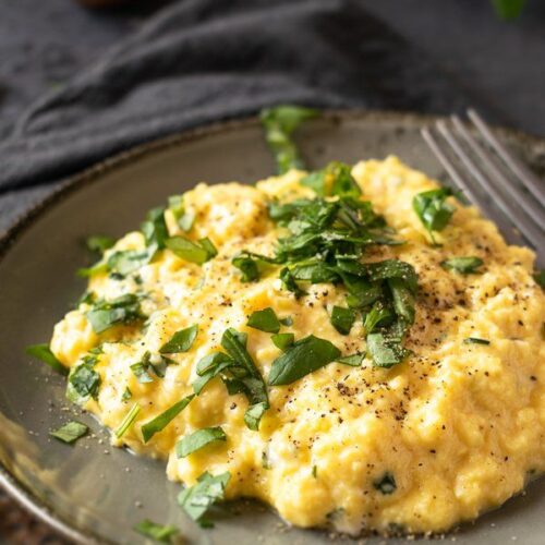 Kombinieren Sie das Rührei mit geräuchertem Lachs, frischem Dill und einem Klecks Crème fraîche.