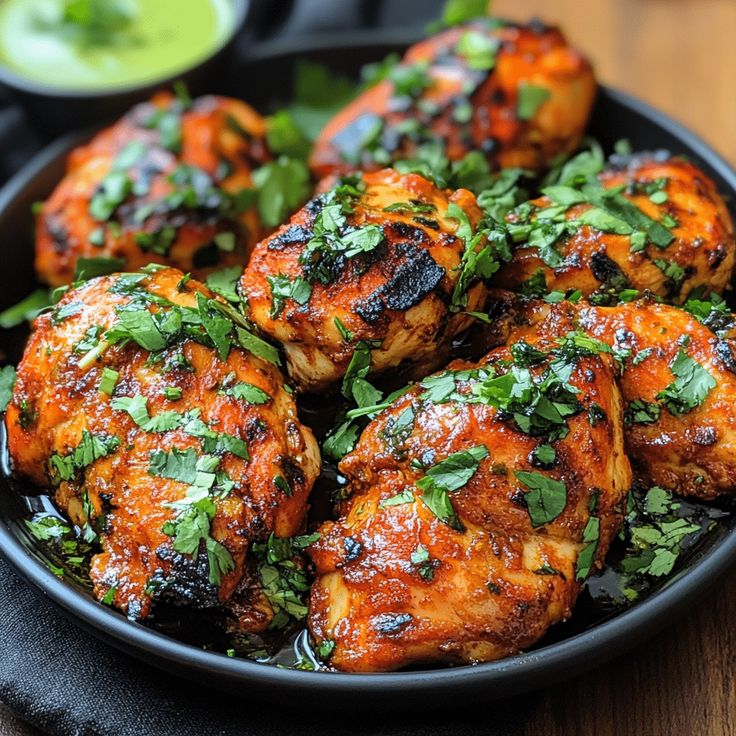Garniere das Huhn mit frischem Koriander, roten Zwiebelringen und einem Spritzer Limettensaft. Ein Hauch Chilipulver obendrauf gibt einen zusätzlichen Farbakzent.