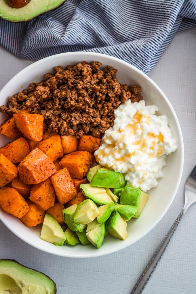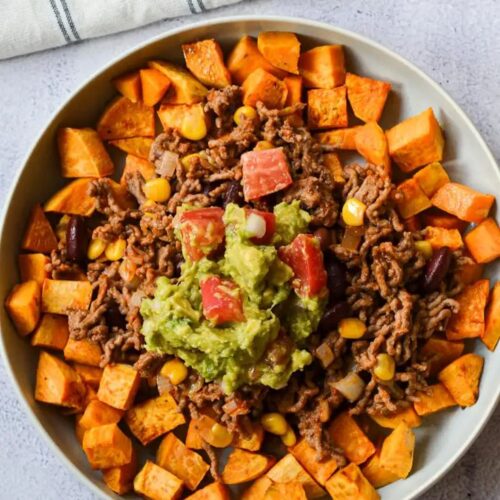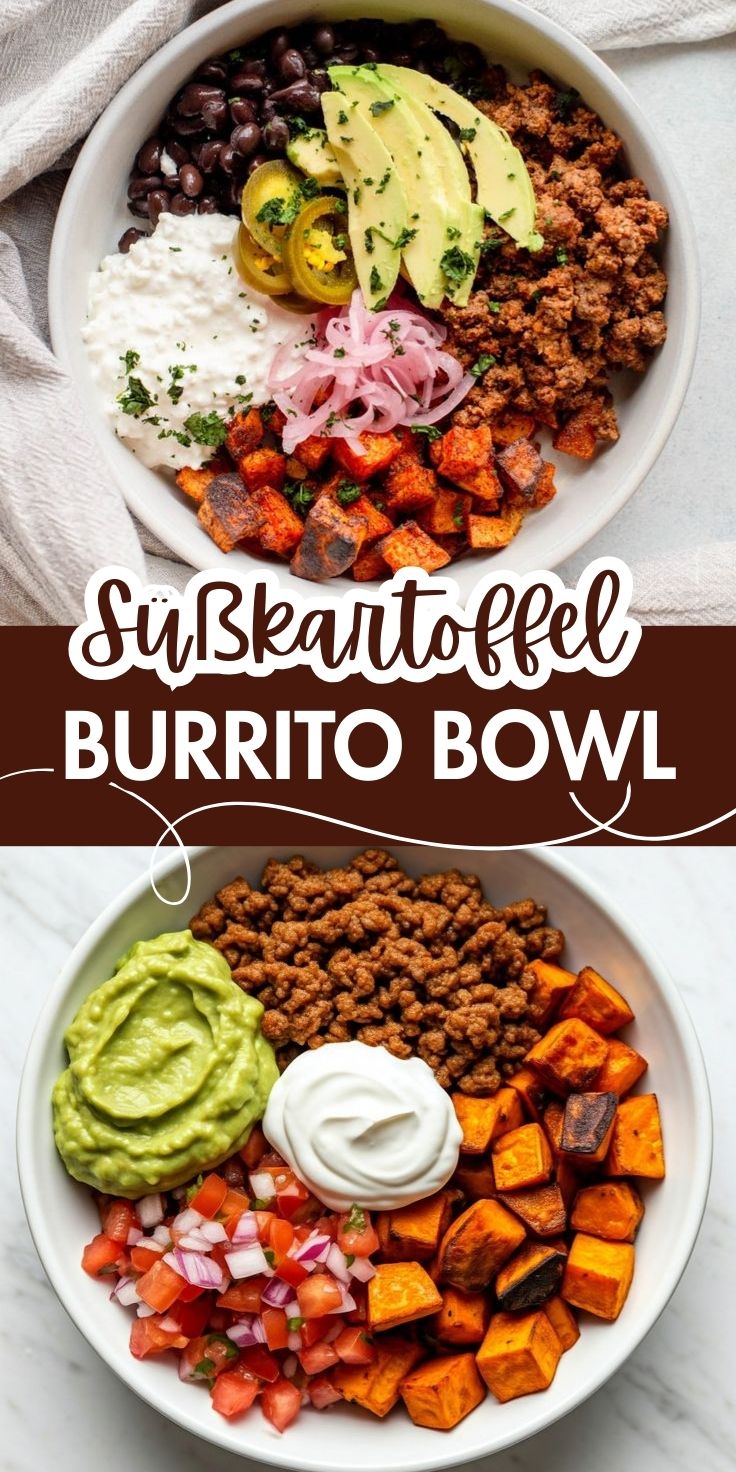 Die Süßkartoffel-Burrito-Bowl ist eine köstliche, gesunde und sättigende Mahlzeit, die vollgepackt ist mit buntem Gemüse, Gewürzen und nährstoffreichen Zutaten.