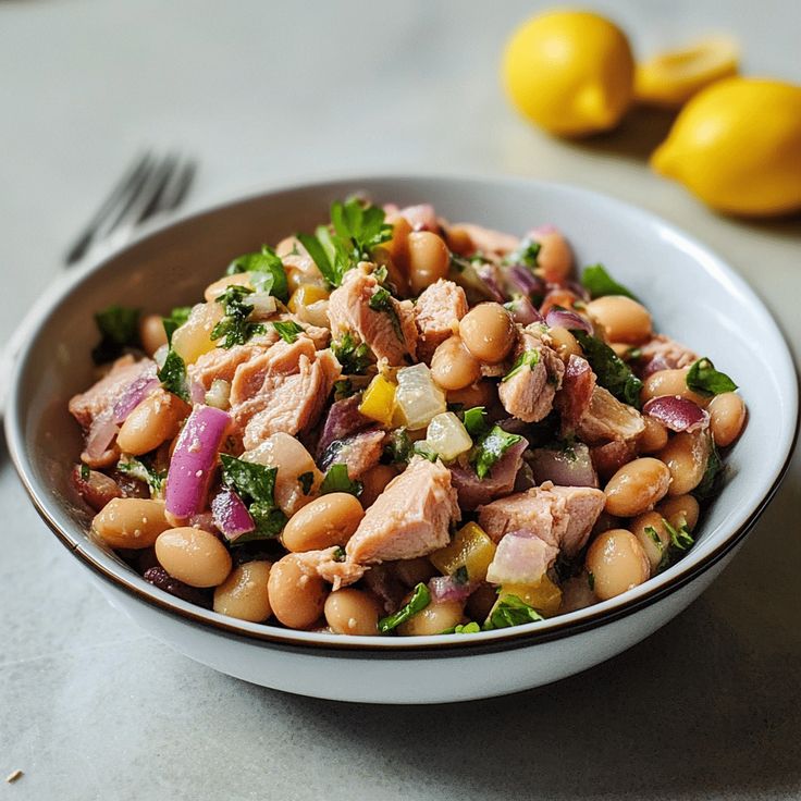Mit hochwertigen Zutaten wie Thunfisch aus der Dose, weißen Bohnen, roten Zwiebeln, frischen Kräutern und einem Spritzer Zitronensaft oder Essig bietet dieser Salat eine perfekte Kombination aus Eiweiß, Ballaststoffen und gesunden Fetten.