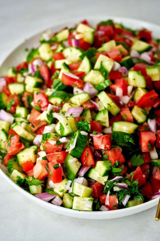 - Schritt 6: Salat zusammenstellen Geben Sie Tomaten, Gurken und Zwiebeln in eine große Schüssel. Gießen Sie das Dressing darüber und mischen Sie alles vorsichtig mit den Händen oder Salatbesteck.