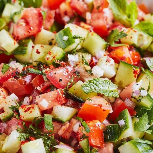 Der Tomaten-Gurken-Salat ist eine erfrischende und gesunde Beilage, die besonders an heißen Sommertagen beliebt ist. Diese klassische Kombination aus saftigen Tomaten und knackigen Gurken verkörpert den Geschmack des Sommers und bringt Frische und Leichtigkeit auf jeden Tisch.