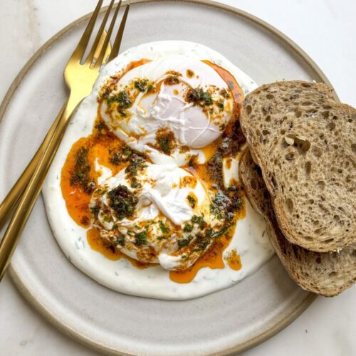 Dieses herzhafte Gericht besteht aus perfekt pochierten Eiern, serviert auf einem Bett aus cremigem, mit Knoblauch verfeinertem Joghurt, und wird mit einer aromatischen Butter mit Paprika oder Pul Biber veredelt.