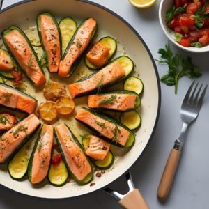 Diese harmonische Kombination aus zartem Lachs und knackiger Zucchini verkörpert moderne, bewusste Ernährung ohne Verzicht auf Geschmack und Genuss. Frische Zucchini wird in der Pfanne schonend angebraten und mit zartem Lachsfilet kombiniert, der reich an Omega-3-Fettsäuren ist.
